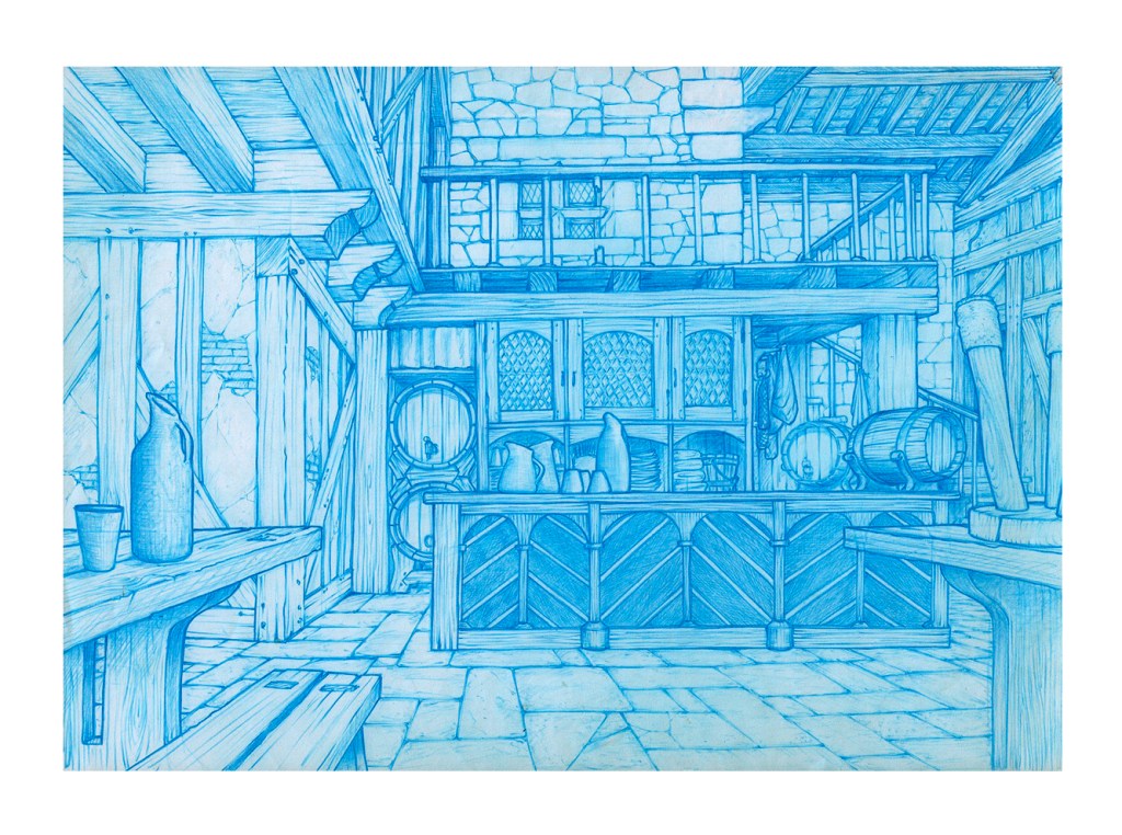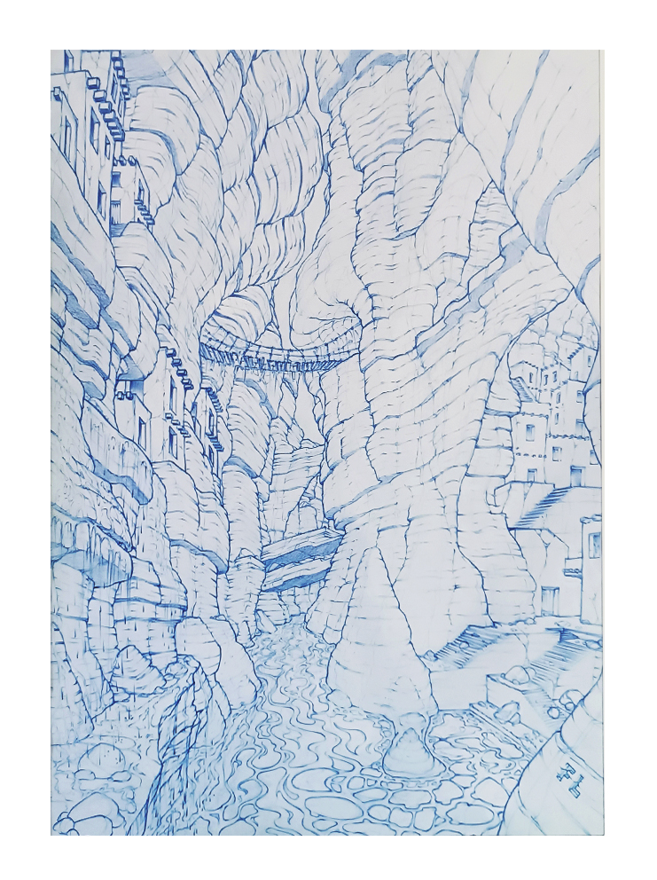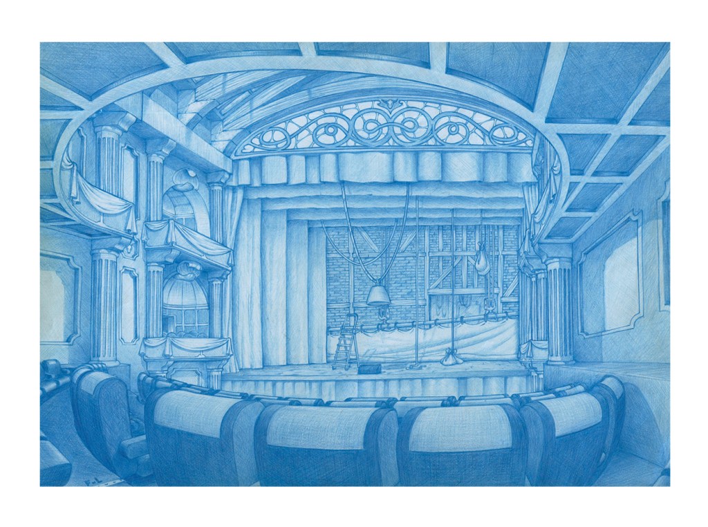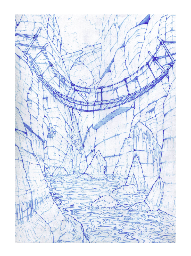 Ma seule construction, faite directement sur le support final, est une ligne d’horizon, un point de fuite et quelques fuyantes.